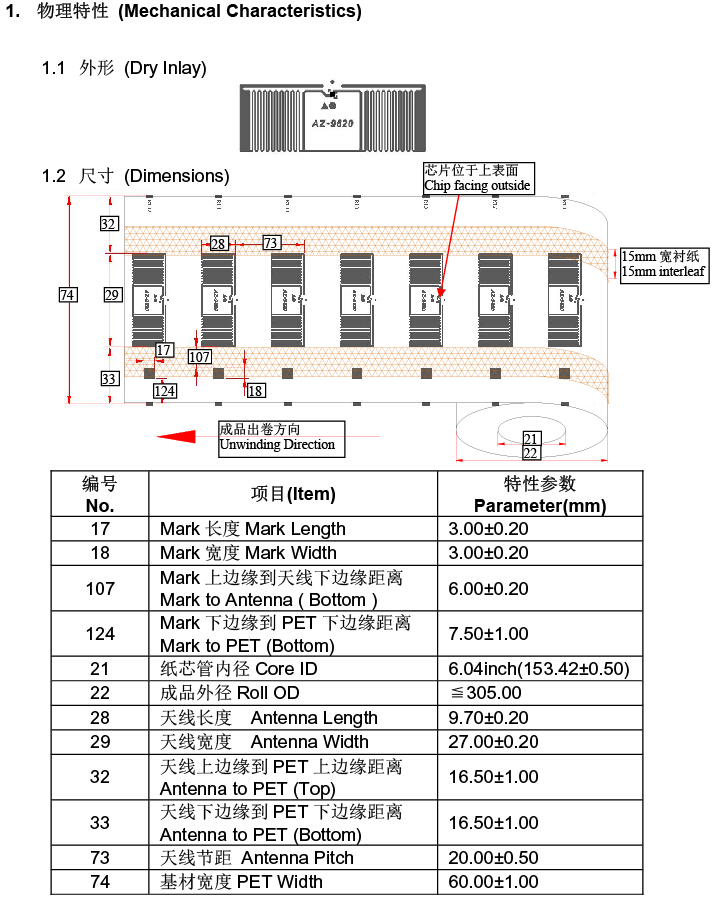 | 封裝材料 | 銅版紙(PET基材)+鋁蝕刻+不干膠(可打印、可印刷、熱敏紙) |